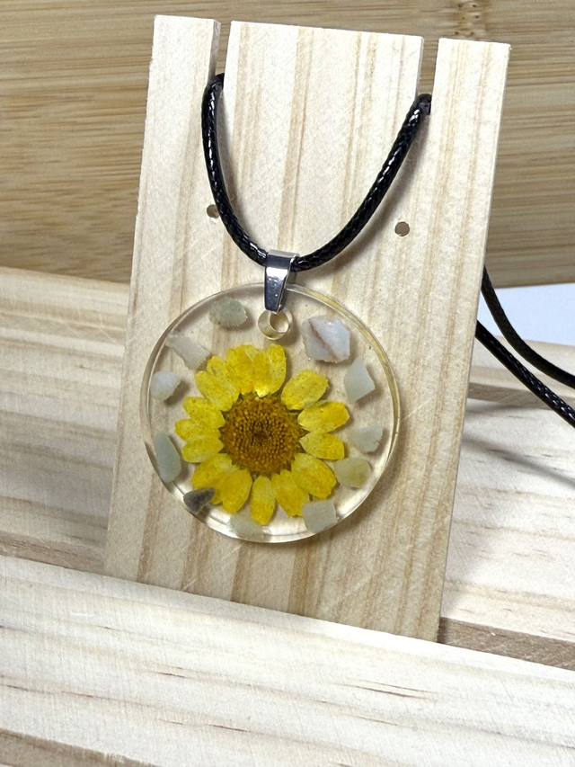 - Pendentif en résine époxy, longueur 5cm - Pierre naturelle : Amazonite - Fleurs séchées - Cordon en nylon ciré de 45cm avec chaînette ajustable